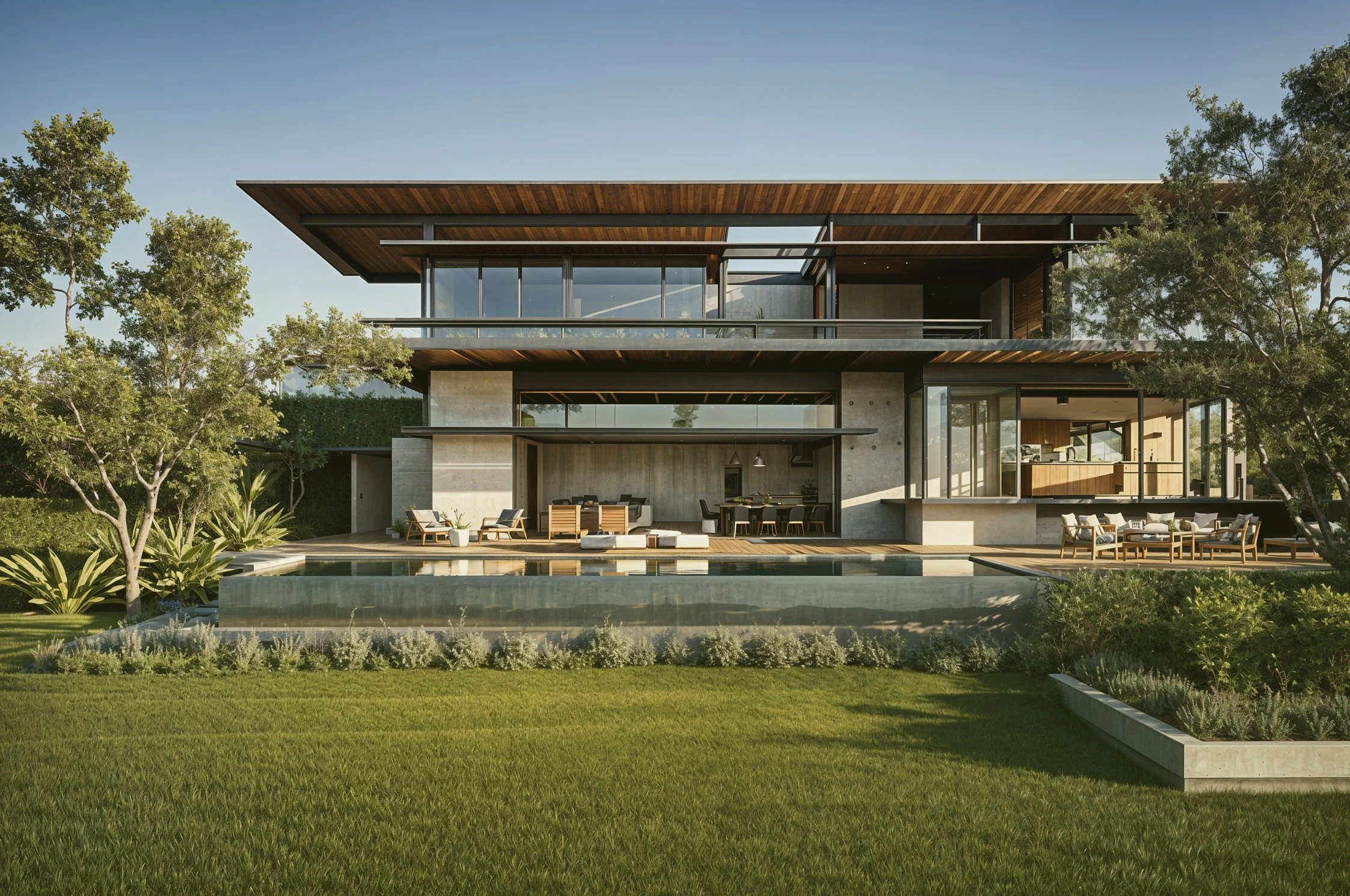 The ground floor dissolves into expansive terraces and a sunlit pool deck, blurring the boundary between interior and exterior. Materials remain honest and timeless: smooth concrete walls, warm timber ceilings, and generous glazing that breathes with the changing light.