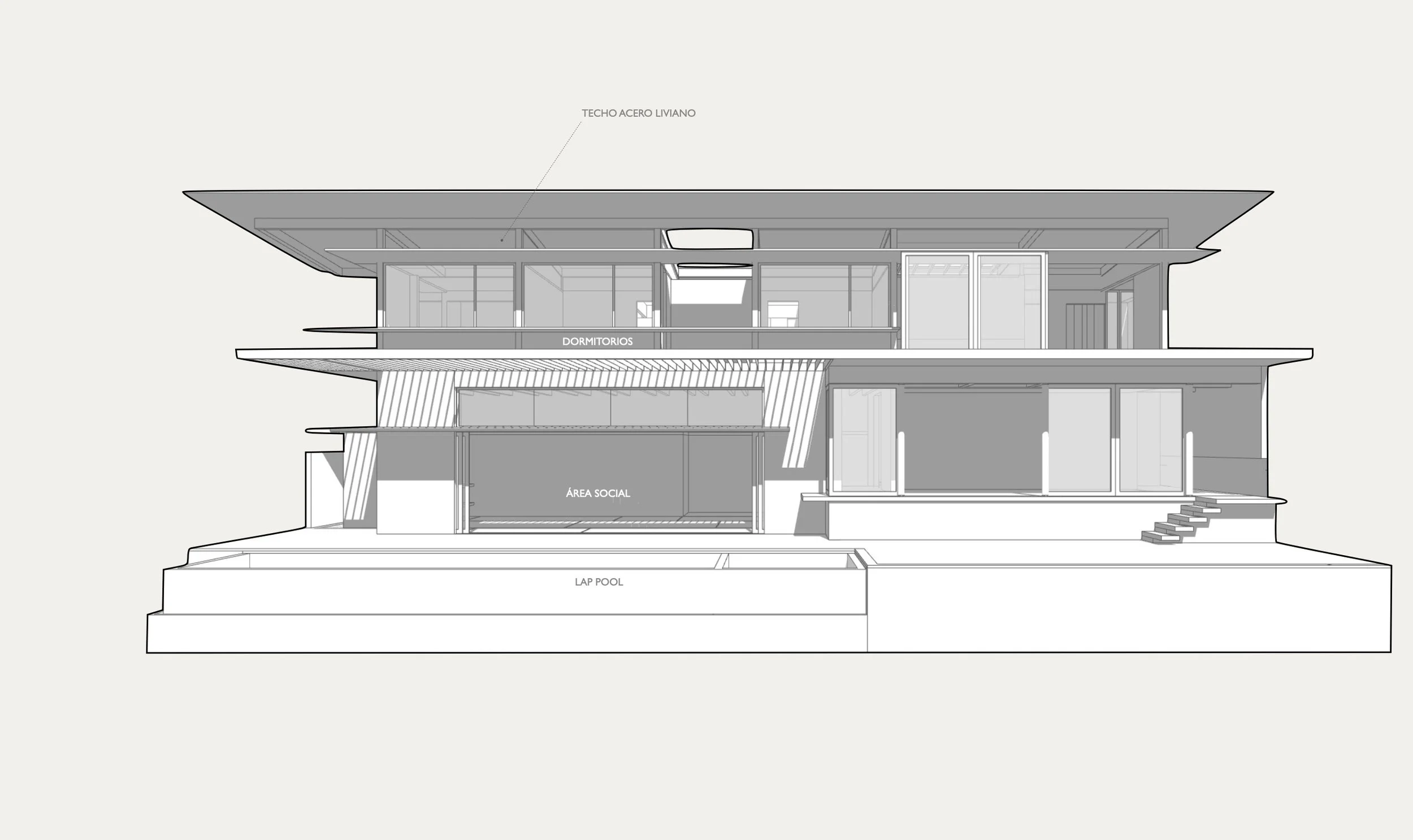 Every element of the design is conceived to emphasize the wide, tranquil line drawn by Lake Amatitlán. In the social area, large sliding glass panels disappear entirely, allowing the interior to merge seamlessly with the endless horizon.