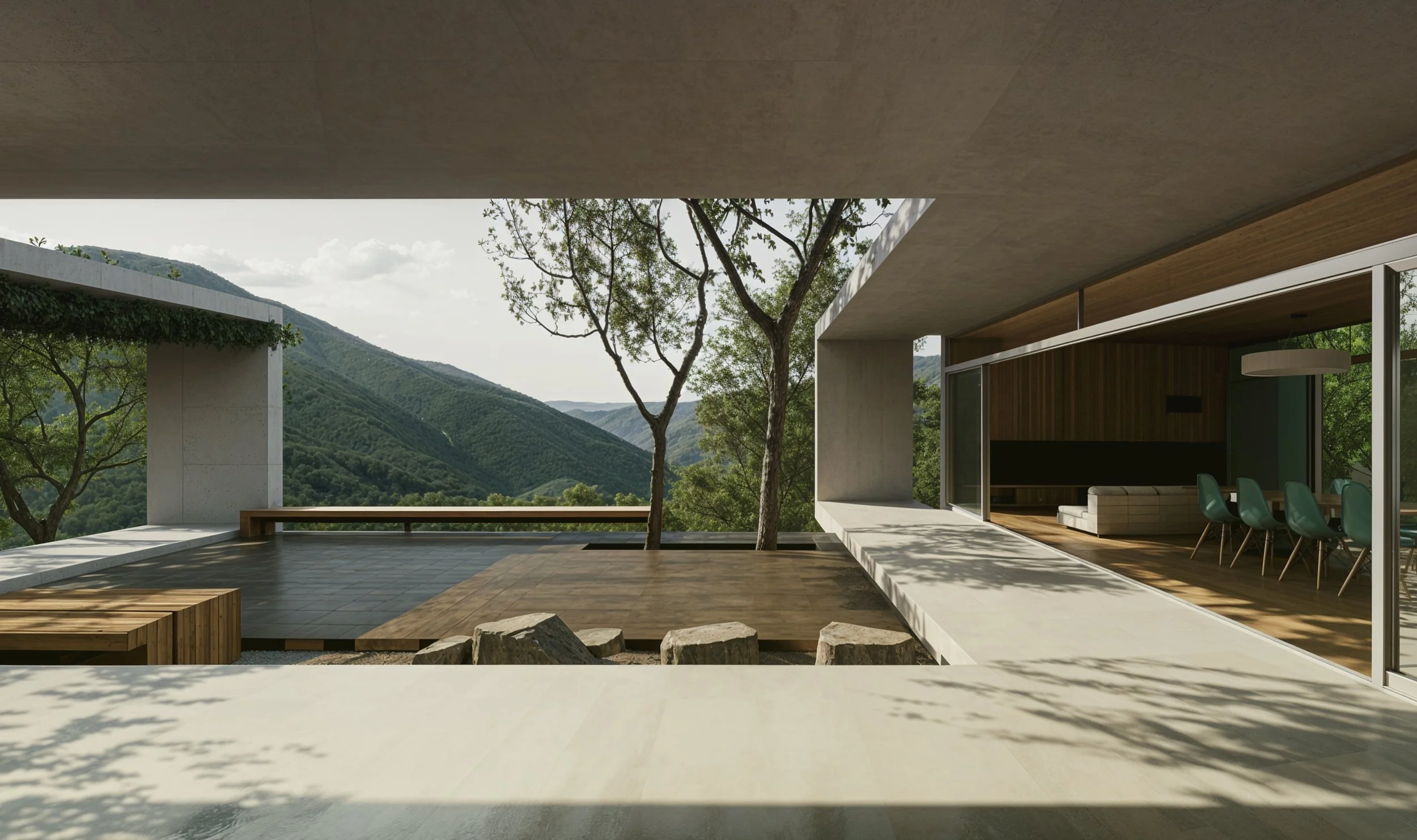 At the heart of the project is the patio, reinterpreted as a sequence of platforms and terraces that extend toward the horizon. Water, stone, and timber define the ground plane, creating a quiet threshold between inside and out. The living and dining areas unfold around this open center, connected by large sliding panels that disappear to create a continuous pavilion.