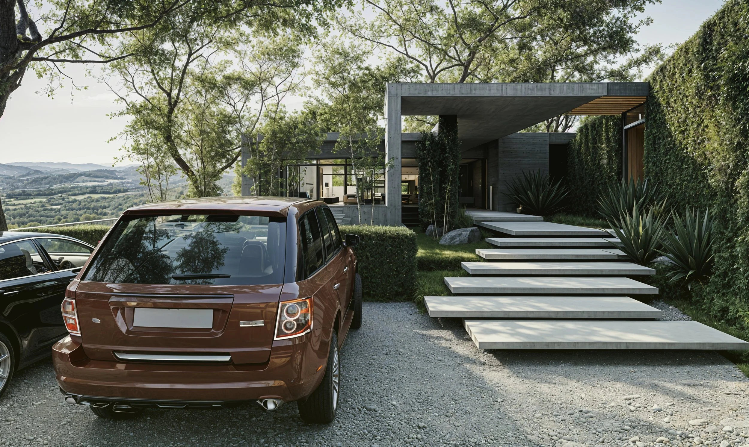 The architecture is composed of floating concrete planes, open-air rooms, and long horizontal lines that frame nature with precision. Light moves freely through the spaces, guided by deep overhangs, timber ceilings, and the shadows of existing trees woven into the design. The result is a house that feels anchored yet weightless, intimate yet open.