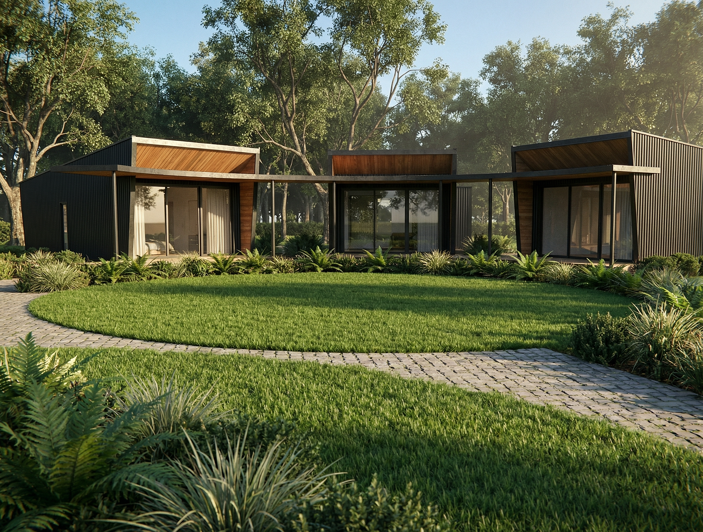 The individual volumes are stitched together by a continuous curved pergola that acts as both connector and threshold—filtering light, framing movement, and establishing a quiet rhythm between buildings.