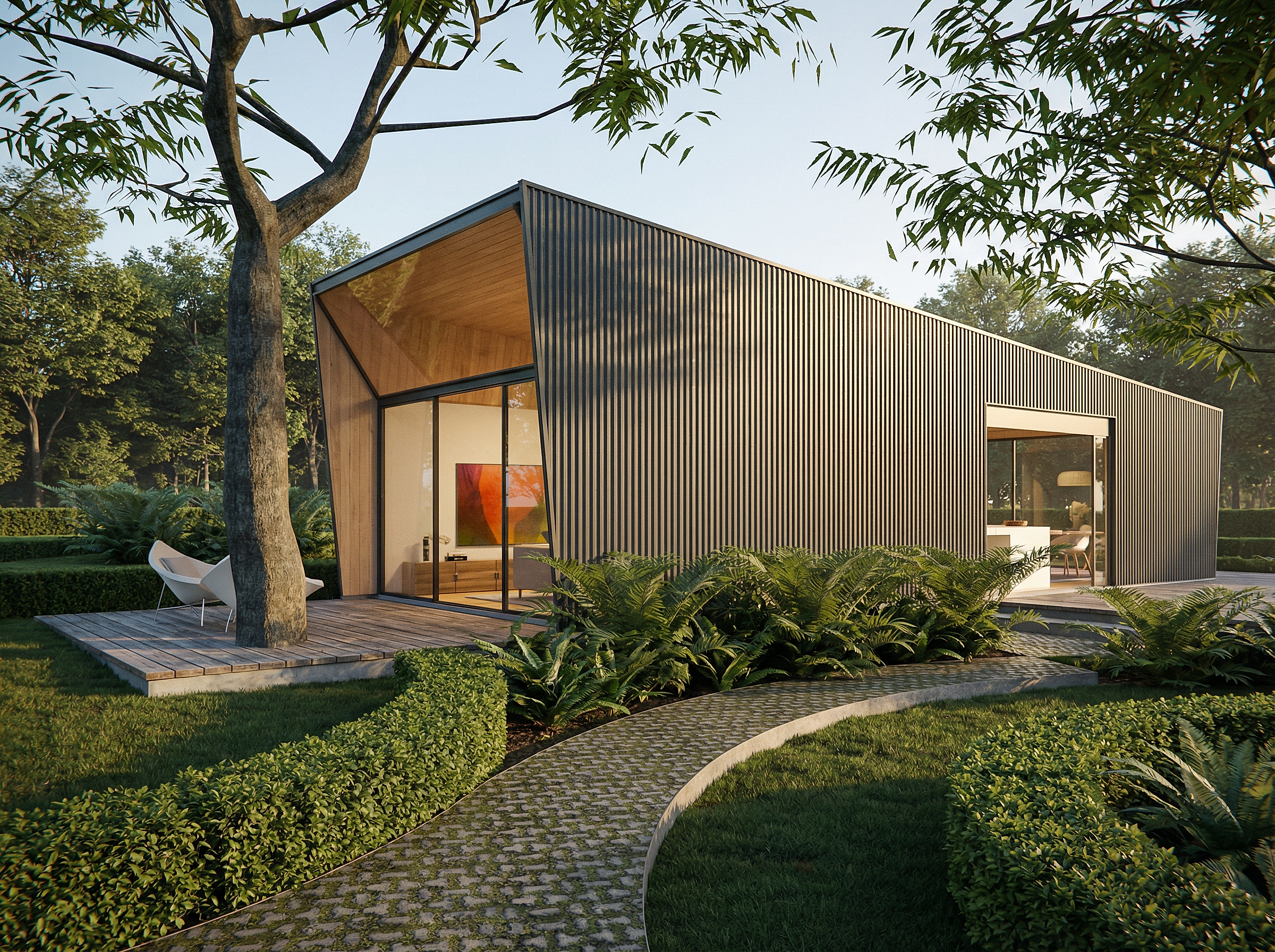 Each pavilion functions as an individual retreat, scaled domestically and positioned within the trees to create moments of privacy and reflection. Inside, the architecture softens. Light oak cladding, warm wood ceilings, and generous glazing introduce a more intimate atmosphere, contrasting the precision of the exterior shell.